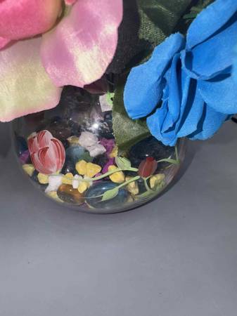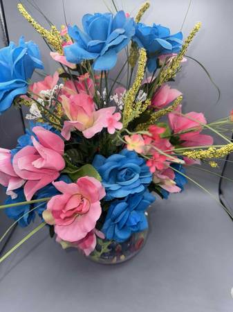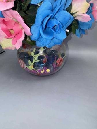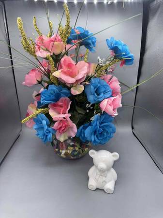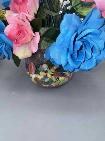 Cute pink & blue artificial flower arrangement decor in hand painted vase filled with colorful peddles, glass stones and colorful Great for decor or cute for gender reveal decor comes with white...