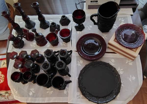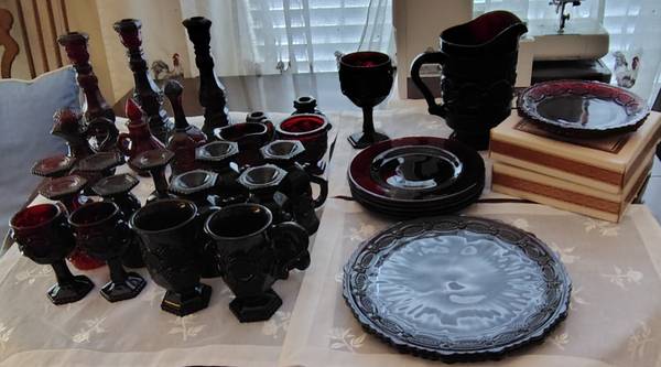 The Avon Cape Cod Collection Ruby Red is a set of vintage reproduction glass collectibles in a striking red color. Made in the United States by the renowned brand Avon.
