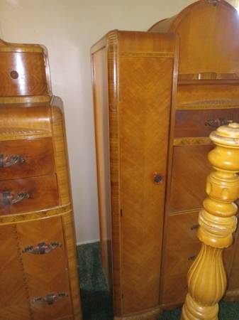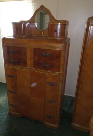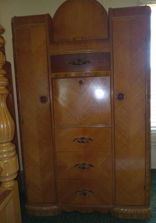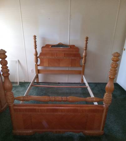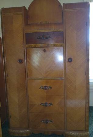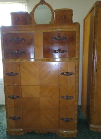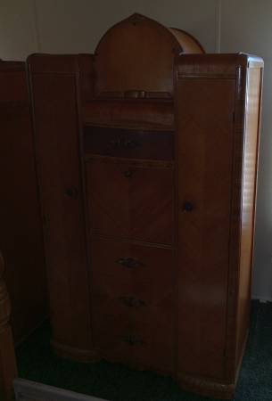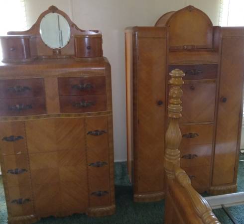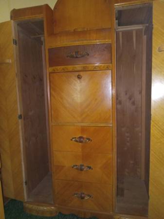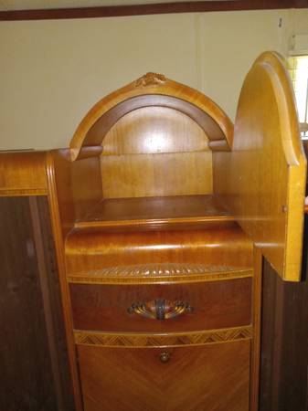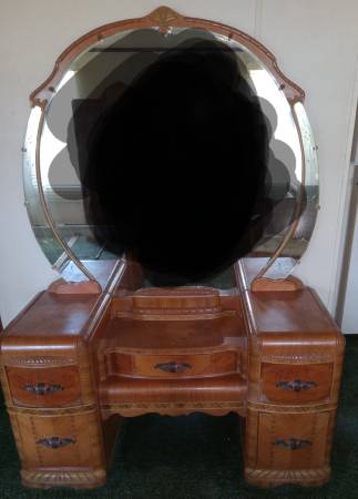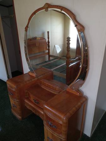Antique Dresser very sturdy, huge mirror, bed frame, must be moved. 4 pieces, A vanity, dresser, wardrobe, bed frame. serious inquiry please.