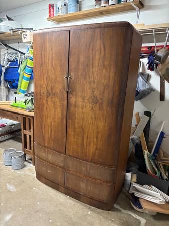 This is a piece I took on as a project, but I have just kinda lost interest. Needs pulls and/or knobs and a sealer on the stain. As most old pieces go it has a musty smell. I have a new can of Shellac I bought to spray and seal the inside. That should seal in and eliminate the odor.