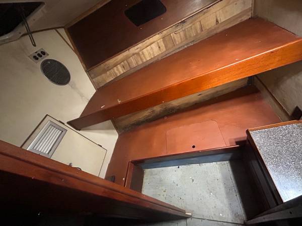 It’s got A good sized front berth, a mid sized stateroom, it’s got a head with a shower and sink as well. The interior of the boat is in fair condition but can definitely use some attention. Two working HVAC systems, two live bait wells, set up for downriggers and outriggers, has 12+ fishing rod holders.