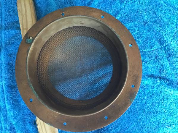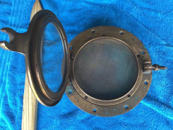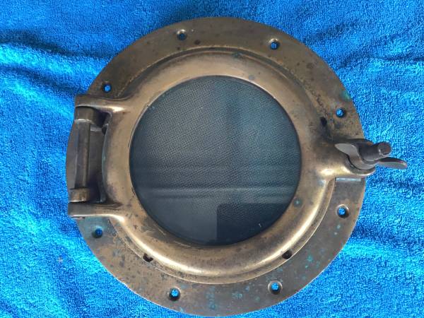 Heavy brass antique porthole. This porthole is over 100 years old. It is in excellent shape. Glass window is 5 1/2 inches and the diameter is 10 inches. Weight is 9 1/2 lbs. This is for the person who has it all. Could be mounted in a boat, in a Man Cave or a She Shed. We used it as a picture frame and conversational piece. This item was from a sailboat. Includes the porthole, original brass screen and mounting ring.
