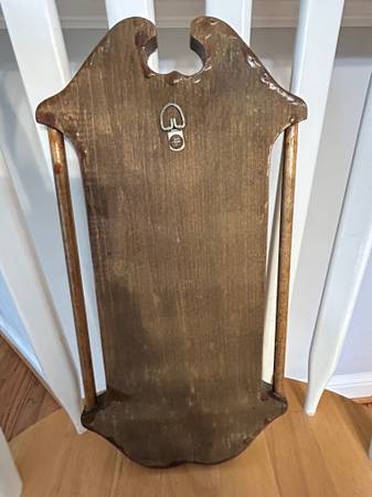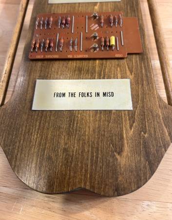 2 brass plates attached to the wooden plaque with information about the components and gift from MISD to the original owner in the US Army