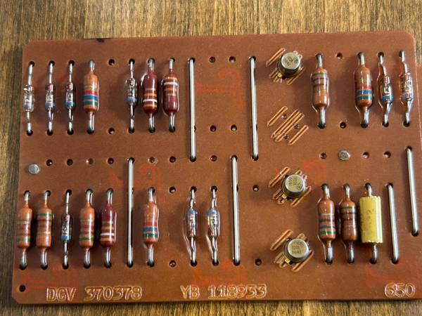 Wooden collectible plaque with component remains of the IBM 7040 from 1977