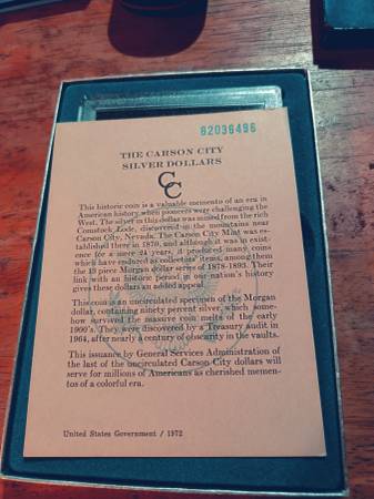 1882 Carson City Morgan silver dollar mint State condition original GSA box and paperwork $350 quite possibly a MS-64 or better.