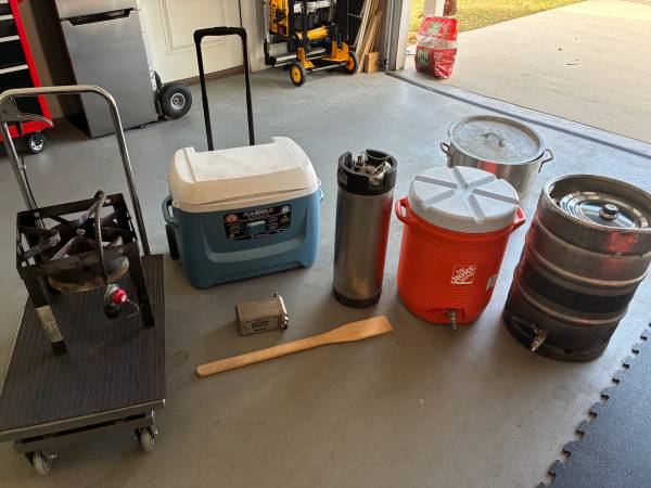 I've upgraded my brewing system and no longer need these items. Items include: a hydraulic lift cart, propane single jet cooker, Blichmann wort chiller, blue rolling igloo cooler (used for sparge water, no modifications), paddle, one corny keg, orange 10-gallon mash tun (modified from a HD cooler), and two kettles. Everything is operational. Will sell any or all for best offer.
