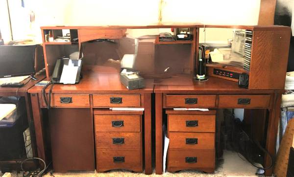 Mission Oak is trending again! This is a gorgeous versatile suite of very high-quality BASSETT office/hobby furniture with inlaid wood and dove-tailed drawers. This is a very classy, unique look and can't be found anywhere as a complete set! REDUCED FROM $3400!