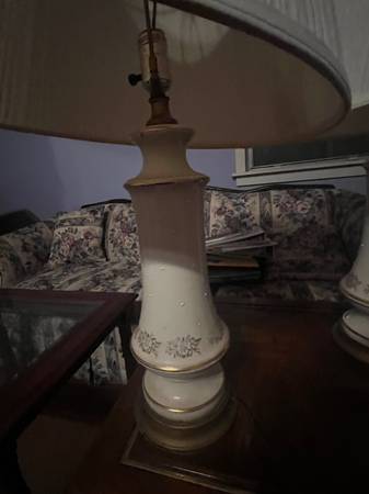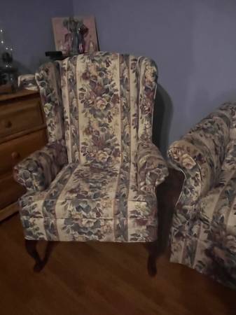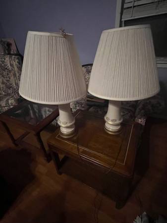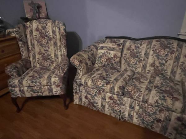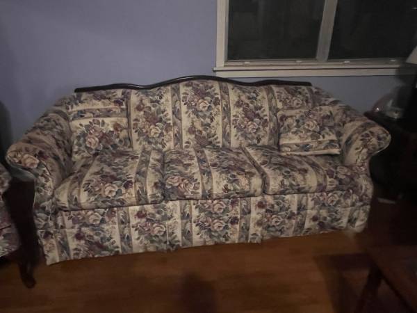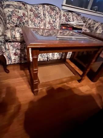 Beautiful Victorian style sofa and armchair in excellent condition. Built well. Two end table tables, solid wood, one has glass top, the other is wood. Two matching lamps complete this setting.