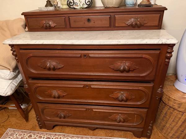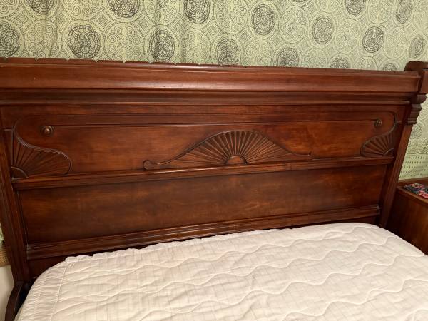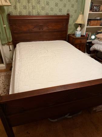 Antique Bedframe (full/double size) to include mattress with topper and Antique marble topped 6 drawer dresser. Good condition. $500 cash for both. Will not split up set.