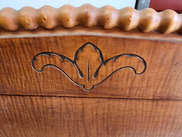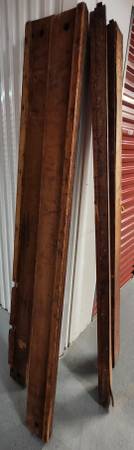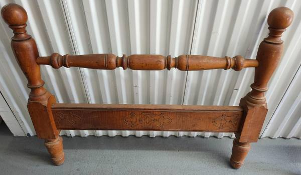 Two beautiful old solid wood twin beds. Wood railings have some lifting of the finish.
