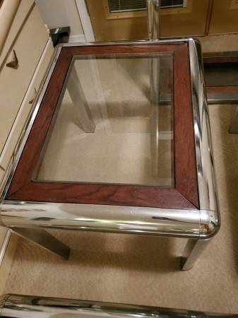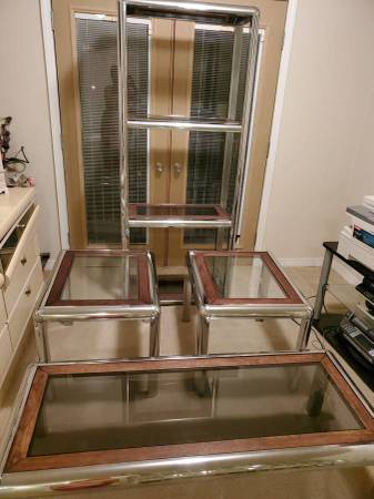 Chrome & glass furniture set - includes coffee table, two end tables and etagere stand- very good condition-$295 Computer Desk with slide keyboard-black metal and glass - $75 Whiteboard 48x36-...