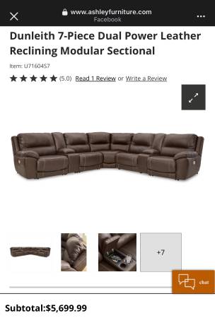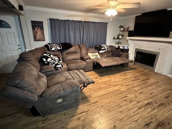 3 power reclining pieces, 2 of the recliners have power headrest. 6 piece sectional. Not leather, but it is the same couch in generic photo posted. There is a USB port on both ends of the sectional. 2 consoles with cupholders.