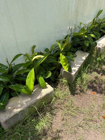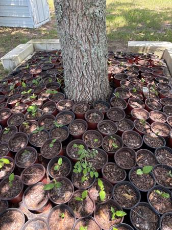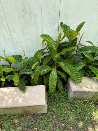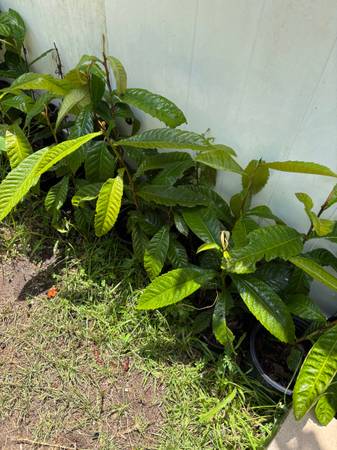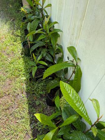 Loquat trees in one-gallon pots, ready to be transplanted to their final location. Also known as Japanese loquats, they are beautiful for your garden and produce delicious fruit