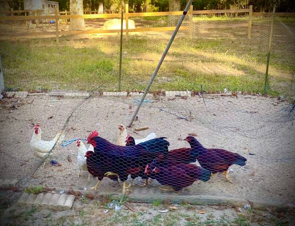 Heritage Rhode Island reds, RIR/leghorn hens, silkies and sizzles (silkies x Cochin Frizzle) baby sizzles, roosters. Quincy, Florida.
