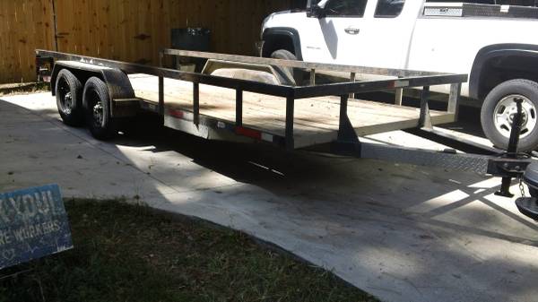 As I have purchased a new trailer, I am selling this one. It is 6.5 x 18' I have owned this for several years, it has been a great trailer. It comes with 4 brand new tires, as I liked the wheels on this trailer instead of the new trailer, I am keeping the old wheels and have installed the new tires on this trailer. It has led lights, 2" ball hitch, saftey chains, It pulls great. I like the 18' long trailer- it has come in very handy many times. I will sell for $ 1550.00 CASH Calls only NO TEXT I have the title. Tandem Axles
