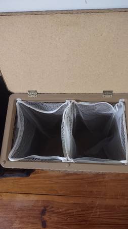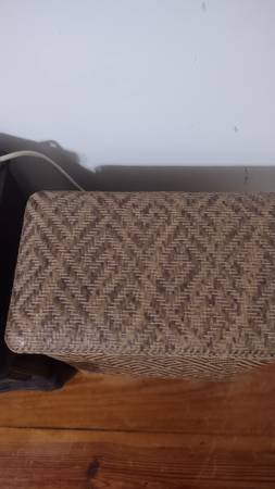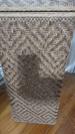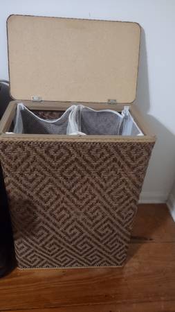 Excellent condition, has 2 removable mesh liners to separate your clothes. Or use it as one whole hamper. There's a shadow on the hamper of me holding the camera to take a picture. There is nothing wrong with the hamper, no stains, no rips, no tears, etc. It is brown & beige & tan colored wicker look. In excellent condition.
