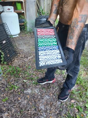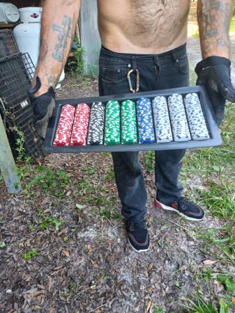 Tray of clay poker chips . About 250 per tray. Have 5 full trays. $15.00 per tray or sell all for $70.00 These are the heavy duty clay poker chips as used for poker tournaments.