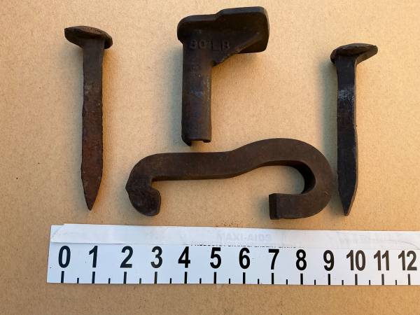 Vintage two railroad track spikes and attachments.