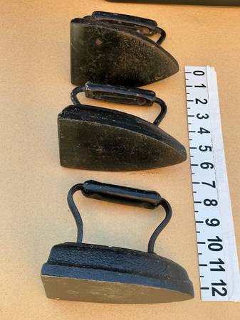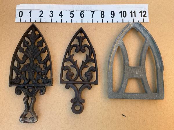 Vintage three cast iron black irons numbered 6ACW, 7 ACW and U XX with three various iron stands.