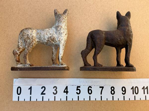 Vintage two 1929 Gifthouse Inc NYC D80L cast iron German shepherd book ens or door stops.