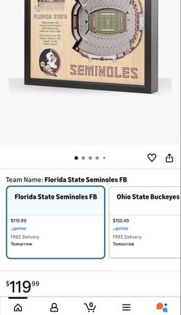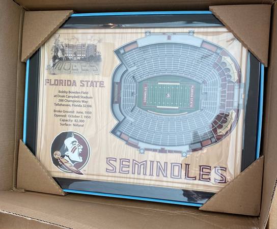 This item was bought for us on Amazon for $120 but never used . It is still in the box, perfect as a gift for an FSU fan. It is 25.5”x19.5”x3.5”. It was assembled from 25 layers of engineered wood....