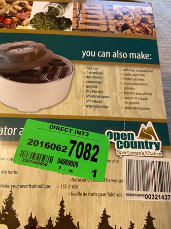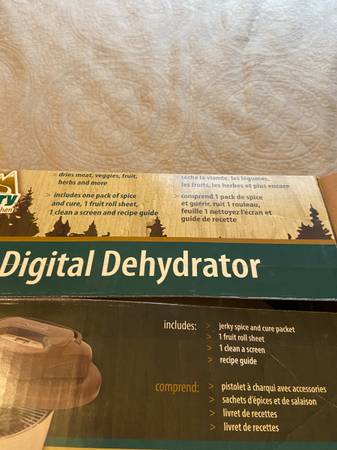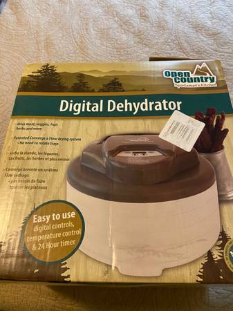 Open country digital dehydrator. Never used. Great for putting up food. 600 watts. Includes 4 plastic durable BPA trays. 3.6 feet of drying space. Dry your own herbs, seasoning, granola, soups and sauces, chips etc. If interested, call and leave a message. No texts or codes.