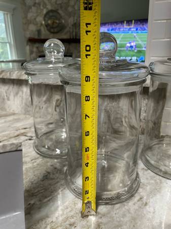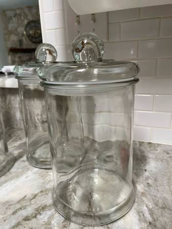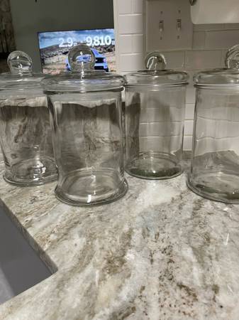 Four glass storage containers with lids. Great for sugar and flower. 10.00 for all.