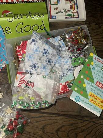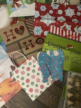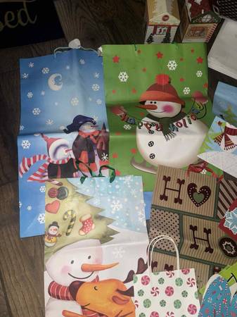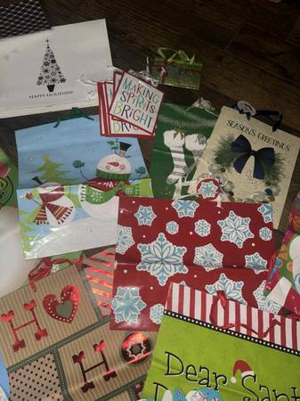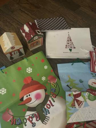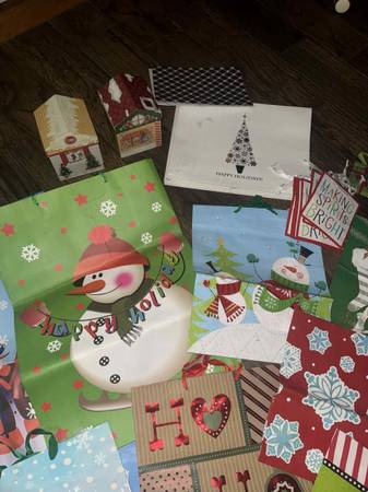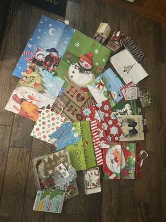Most are new unused Gift bags range from mini to X-Large Small-Medium size gift boxes Present tags and stickers Left over wrapping papers Rolls of ribbons