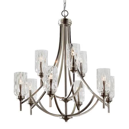 This brushed nickel nine light chandelier is part of the Latchbury collection. The textured glass shades provide ample illumination. Coordinate with other fixtures from the Latchbury collection for a cohesive lighting plan.