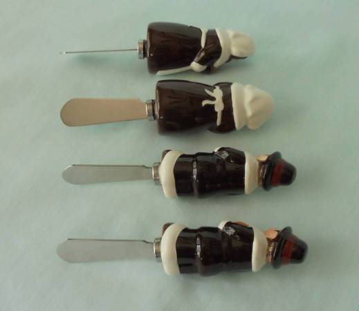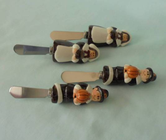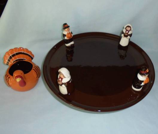 Thanksgiving Holiday Chip N Dip Serve Ware Chang Wei - 6 Piece Set Pilgrim Hat Shape Platter Plate 12 1/2" round x 3 1/8" tall Turkey Shape Dip Bowl 5" x 4 1/4" wide x 3 3/4" tall 4 Serving Knives...