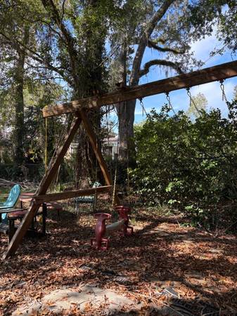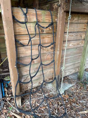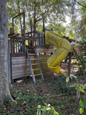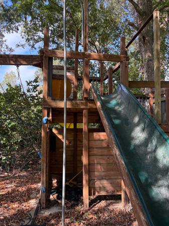 This was a vintage 100% cedar playset that cost over $3,000 new. some of the wood is rotted. Roof tarps have holes. Slides and swings, are sturdy. Other parts are in good condition.
