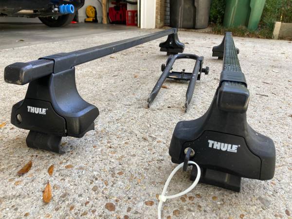 Thule roof racks with gutter mounts and key lock. Also included is a bike tire holder. The bars are 50” long; this kit was previously used on a 2011 Prius.