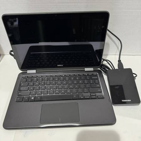 DELL Inspirion 11, 3000 Series, 2-in-1 Model 3185 Laptop and Tablet computer. 11.6" Touch Display with webcam. AMG A9-9420e processor, 4GB memory, 500GB hard drive. Integrated Radeon R5 graphics, Windows 10 (can be upgraded to Windows 11 easily), complete with AC charger. Includes a Toshiba external 500GB hard drive as well. Older model, boots up slowly, but then is fine!! Call to see & pick up. 850-five-six-six, ten, sixty-five. Bob