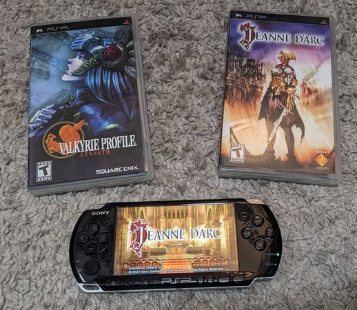 PSP 3001 that I bought new in 2011. It works like new with a great screen (no yellowing or things like that). Comes with an original Sony battery that holds a long charge. It comes with two games, Jeanne D'Arc and Valkyrie Profile Lenneth, complete with cases and manuals. All in good condition. Official Sony charger is also included.