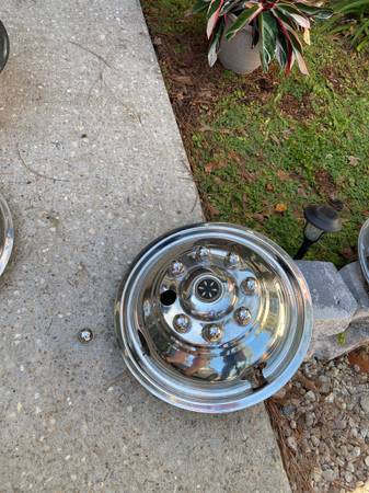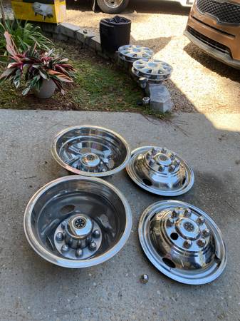 Set of 4, Fits 16 inch chevy vehicle. My son hit one of the front hubcaps with a mower and knocked off the fake lug which caused a little damage to the roundness of the hole it goes on. Still useable, but please look at picture to see what I am describing.